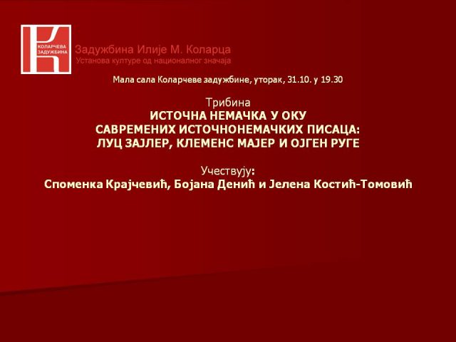 Ciklus tribina SUSRET S PROMENOM – PRELOMNI TRENUCI U OGLEDALU SAVREMENE NEMAČKE KNjIŽEVNOSTI Povodom počasnog gostovanja nemačkog jezika na beogradskom Sajmu knjiga, Kolarčeva zadužbina organizuje ciklus tribina SUSRET S PROMENOM – PRELOMNI TRENUCI U OGLEDALU SAVREMENE NEMAČKE KNjIŽEVNOSTI. Na prvoj tribini, 17. oktobra, Miroljub Stojanović i Jelena Kostić-Tomović razgovaraće o krizi savremenog sveta, globalizaciji i…