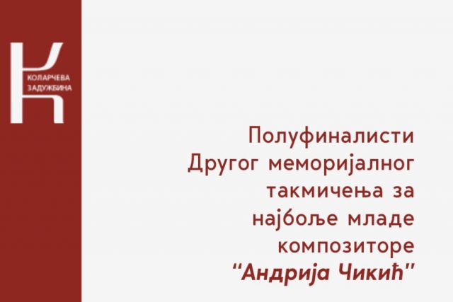 Semi-finalists of the Second Memorial Competition for the Best Young Composers „Andrija Čikić“: I category 10 – 14 years Bogdan Andrić Zorana Mirković Nikola Matić Sergej Pejić David Božić Iskra Mačukat Maša Milivojević Vasilije Vujić Andrija Vasiljević Dimitrije Dumanović II category 14 – 19 years Josip Gorjanac Nikola Kočović Teodora Nikolić Kristijan Jovićević Sara Janevska…