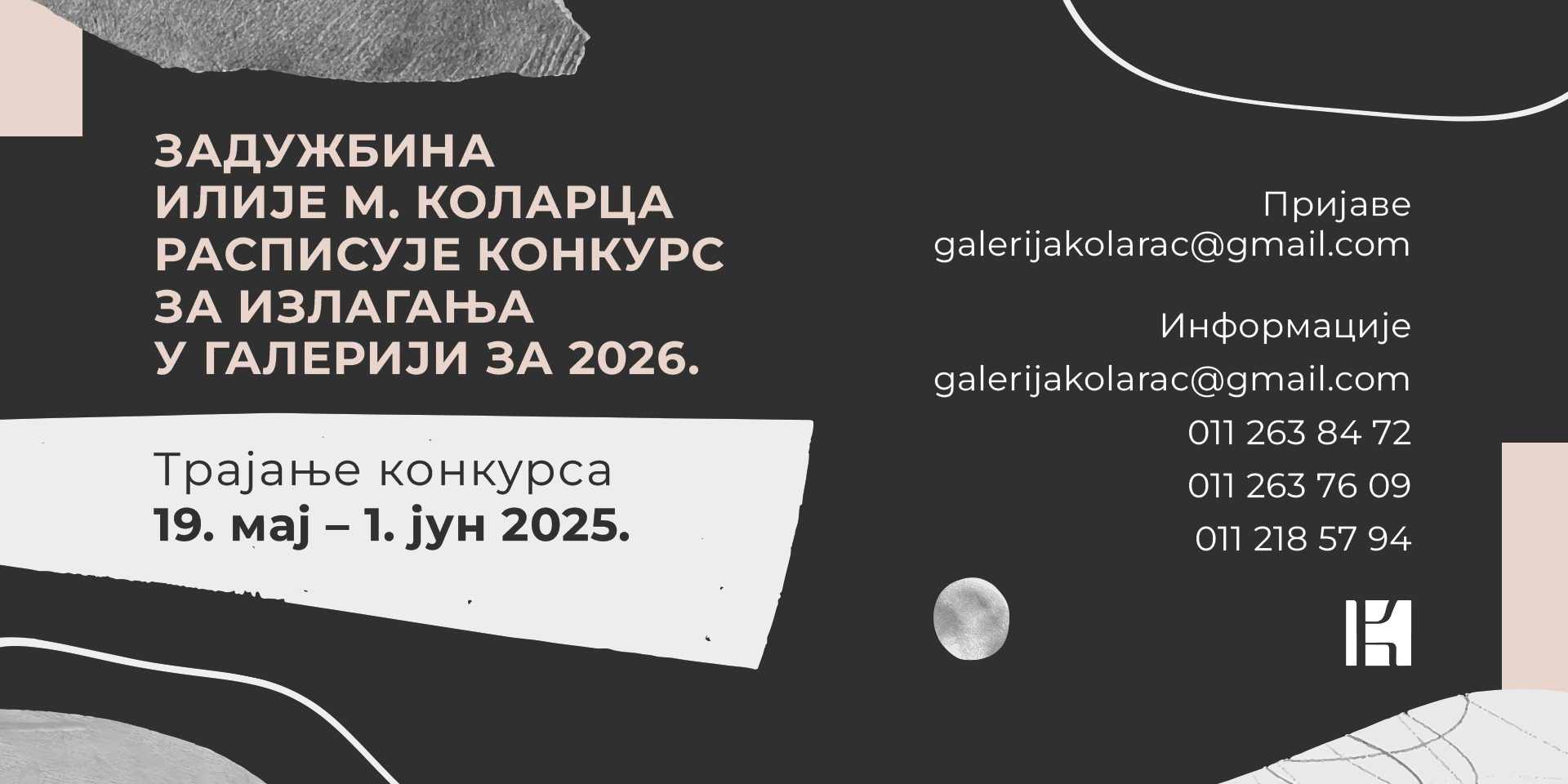 - Prijave dostaviti na mejl adresu: galerijakolarac@gmail.com