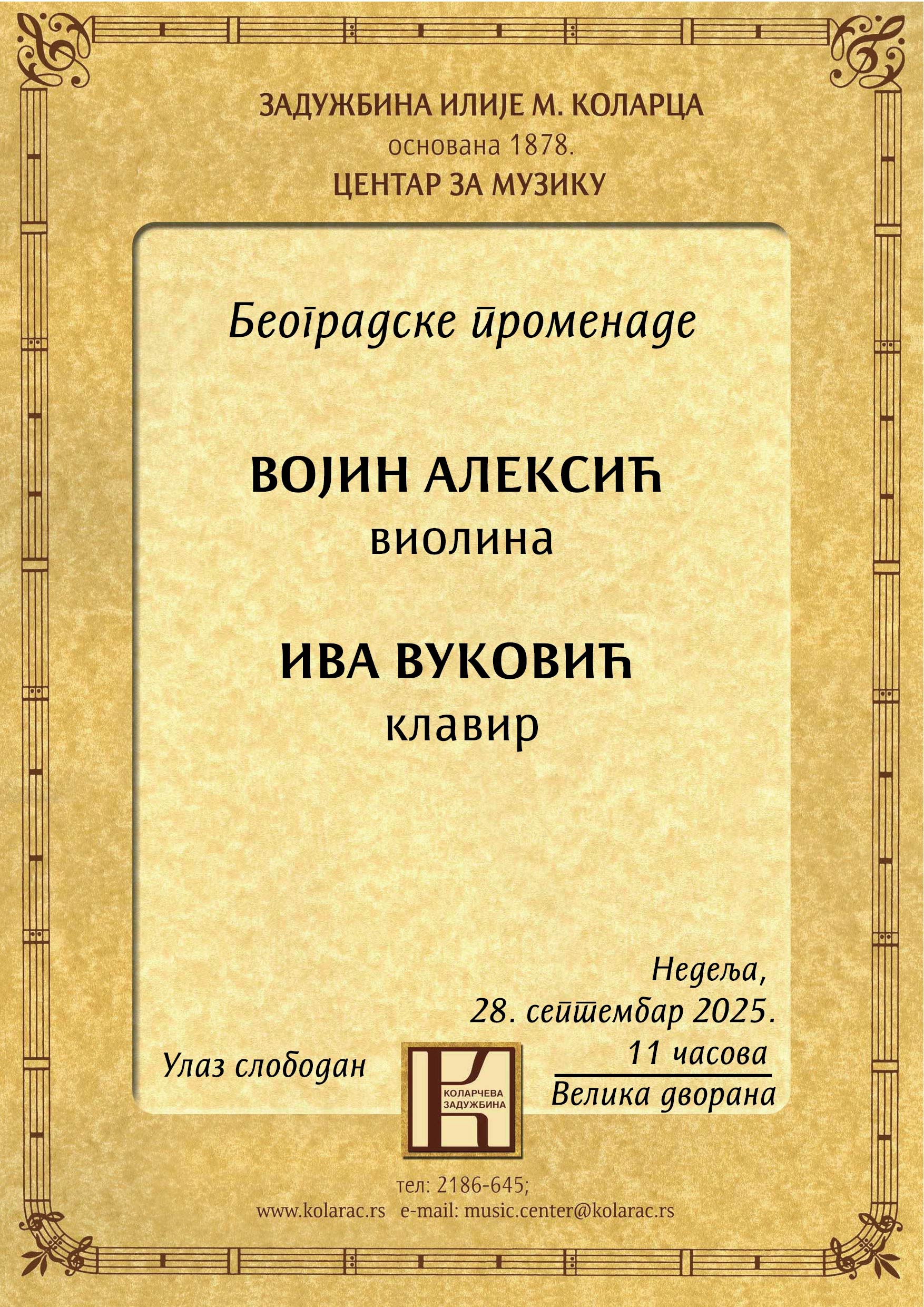 Belgrade Proms Iva Vuković, piano Vojin Aleksić, violin Concert programme Production: Music Centre Admission free