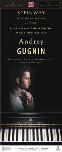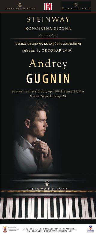 Andrej Gugnin, ruski pijanista za koga kritičari kažu da je jedan od najuzbudljivijih pijanista svoje generacije, nosilac prvih nagrada na prestižnim takmičenjima Đina Bahauer i Sidnej. Premijerno će beogradskoj publici predstaviti sonate Betovena i Šuberta.