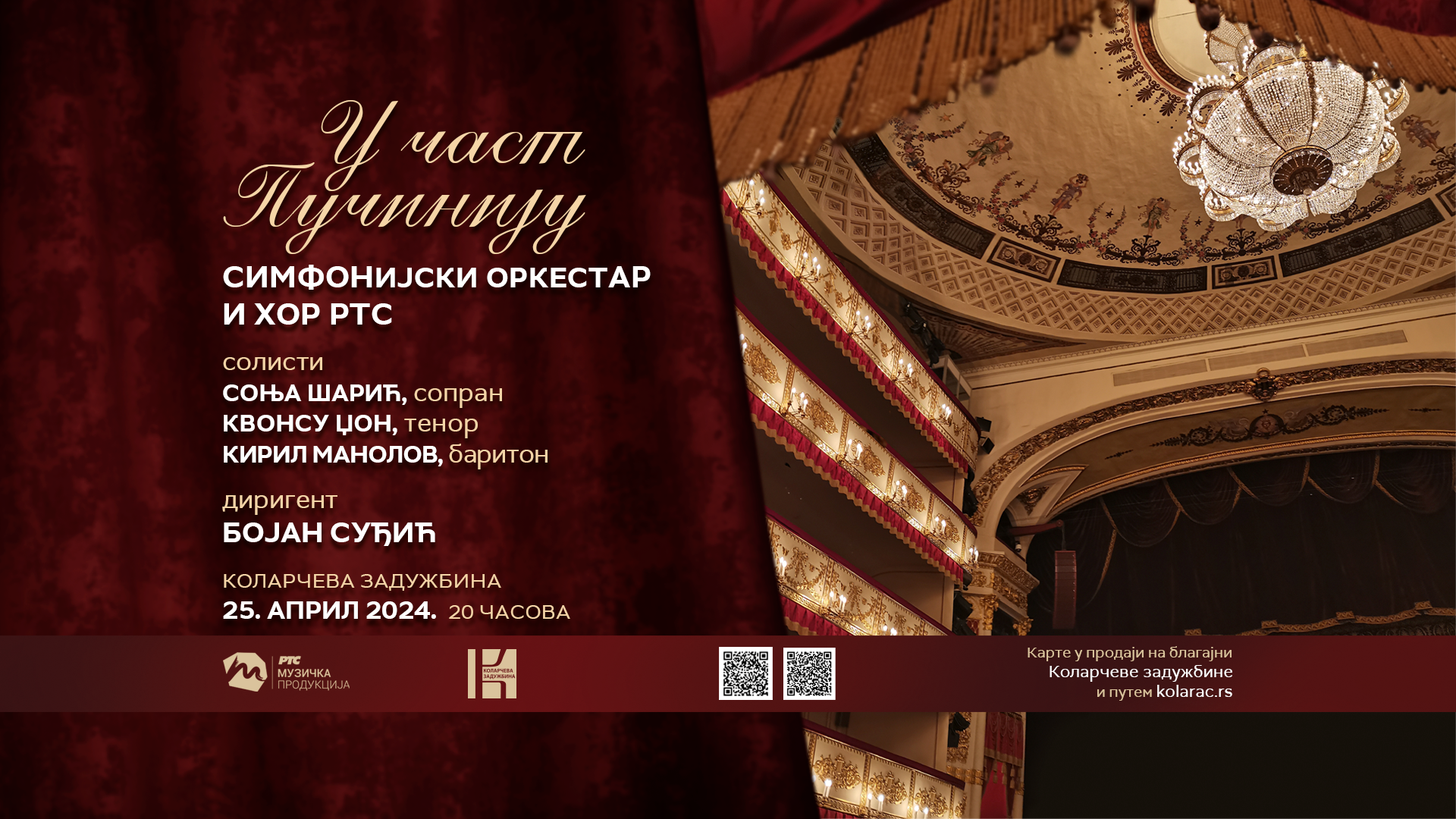 Хор и Симфонијски оркестар РТС, маестро Бојан Суђић и врхунски солисти Соња Шарић, сопран, Квонсу Џон, тенор и Кирил Манолов баритон, извешће композиције Ђакома Пучинија – „Messa di Gloria“ и познате арије из његових чувених опера.